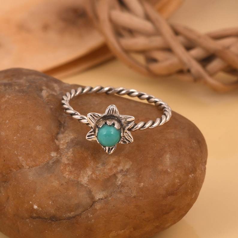 แหวนเงินสเตอร์ลิงสีฟ้าครามทำด้วยมือแหวนลายดอกไม้สไตล์โบฮีเมียนเครื่องประดับเทอร์ควอยซ์ธรรมชาติของขวัญสำหรับเธอ