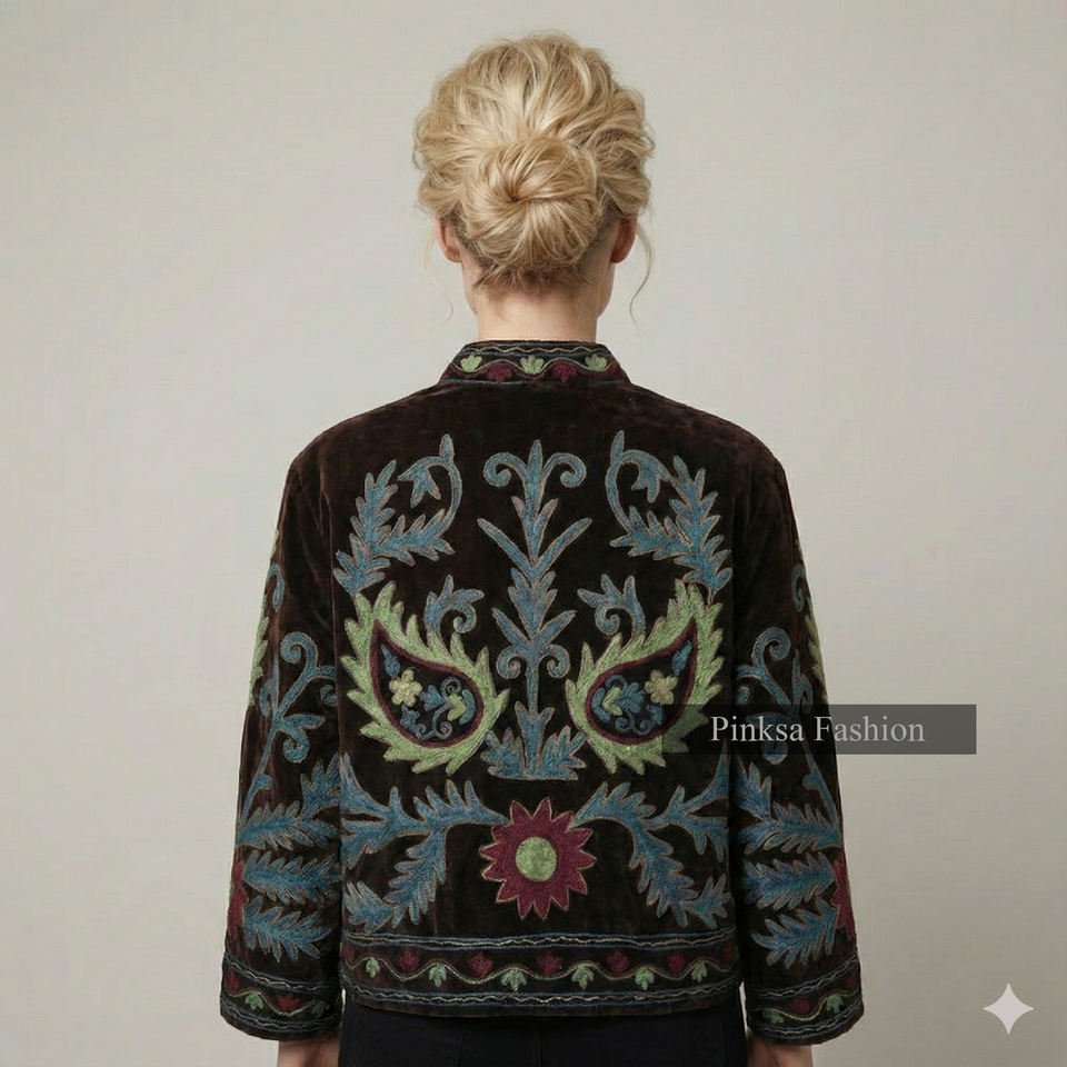 เสื้อแจ็คเก็ตซูซานีผ้ากำมะหยี่ฝ้ายถักมือ | เสื้อโค้ทฤดูใบไม้ร่วง/ฤดูหนาวสไตล์โบฮีเมียนสำหรับผู้หญิง | ลายปักดอกไม้ เป็นมิตรกับสิ่งแวดล้อม