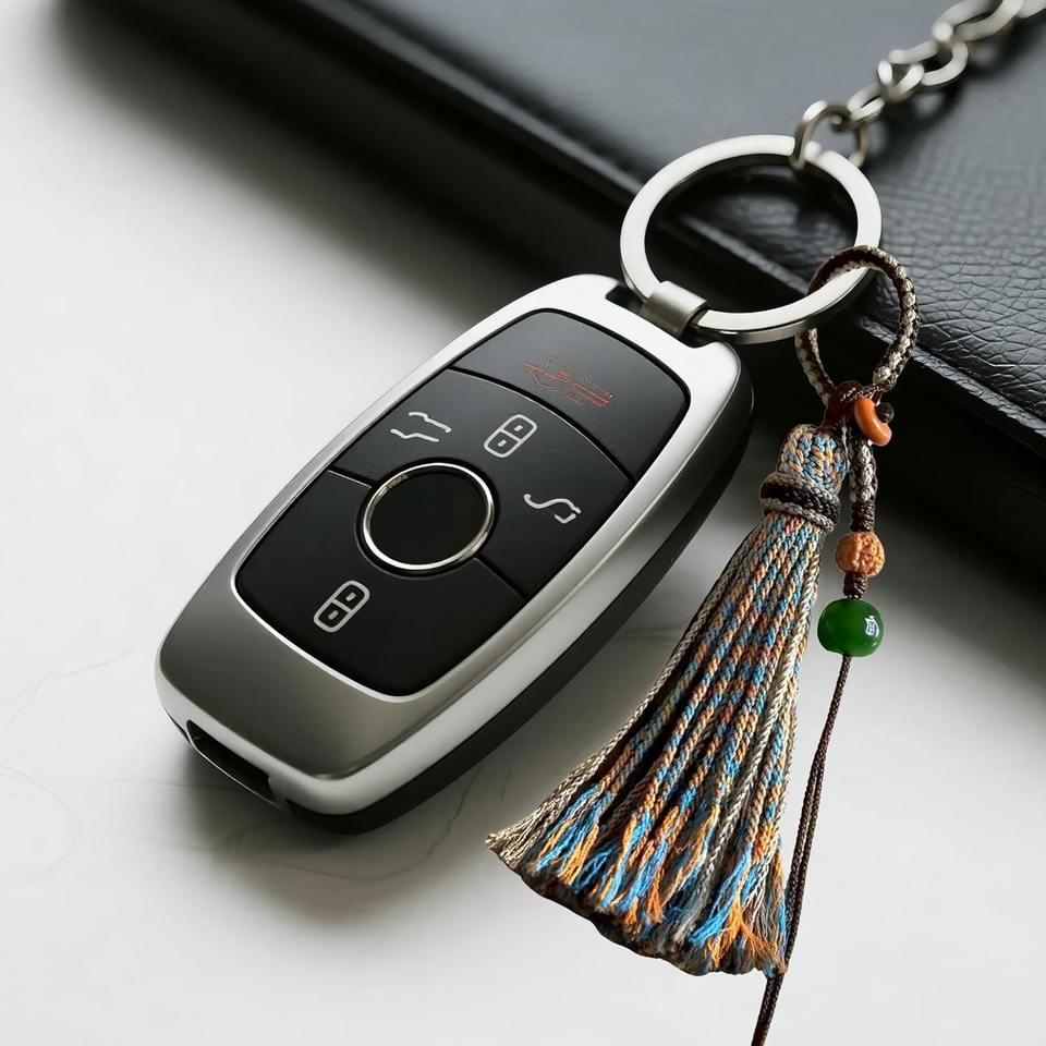 พวงกุญแจถักไหมพรมทำมือพร้อมพู่ห้อยตกแต่งด้วยลูกปัดซินนาบาร์และหยกขาว เหมาะสำหรับผู้หญิง ใช้กับกุญแจรถหรือกระเป๋าเป้