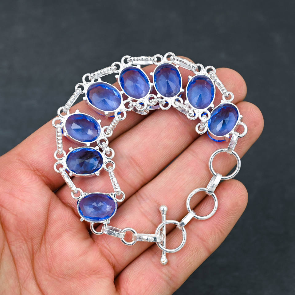 สร้อยข้อมือพลอยบุษราคัมสีฟ้าจากแล็บทำด้วยมือโซ่ชุบเงิน925เครื่องประดับดีไซเนอร์หรูเครื่องประดับ7-8นิ้วของขวัญแต่งงานสำหรับเธอ