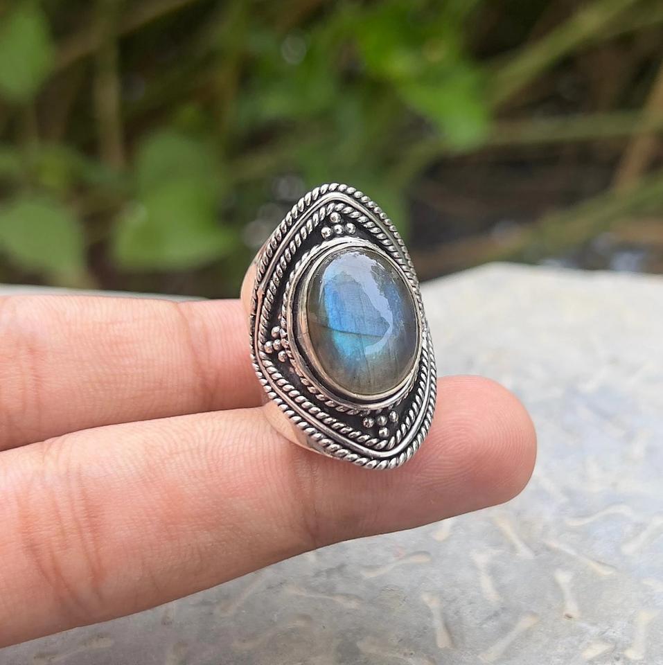 แหวนแลบราโดไรต์ทำด้วยมือแหวนไฟสีฟ้าเครื่องประดับ925เงินแท้ของขวัญแหวนแต่งงานสำหรับเด็กผู้หญิง