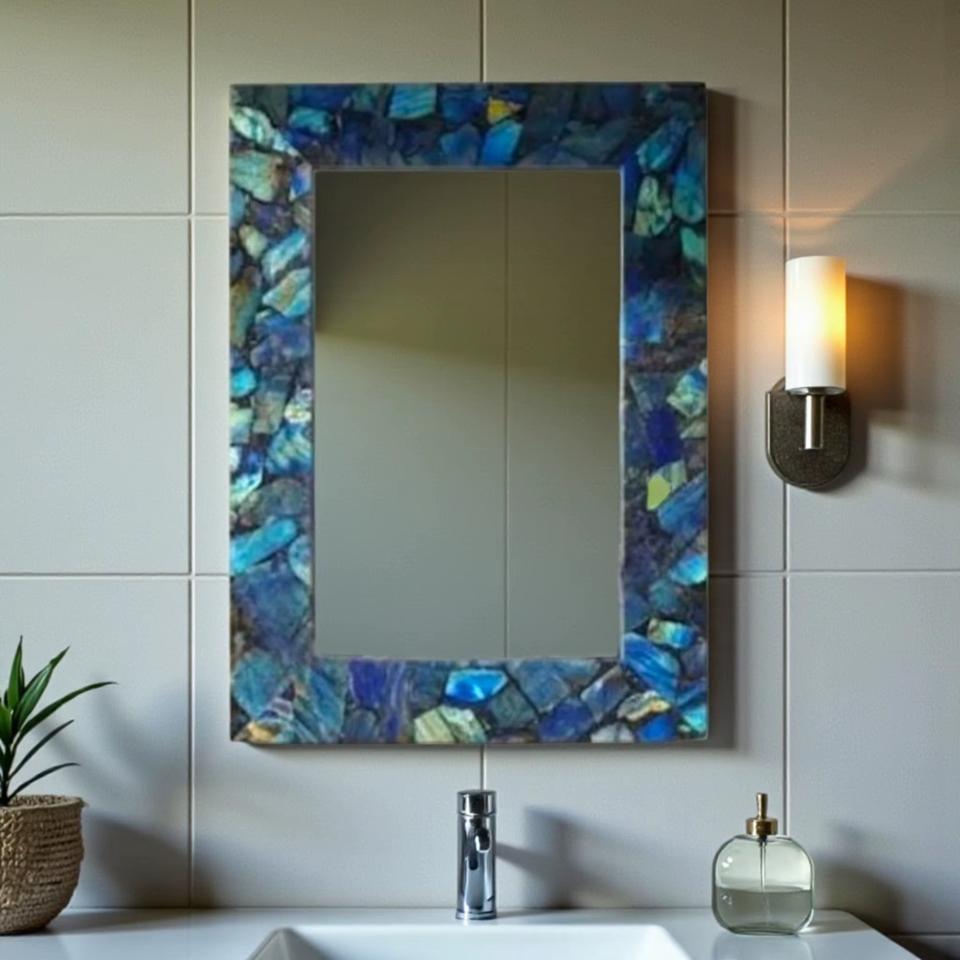 กระจกหินอัญมณีลาบราดอไรต์ทำมือสไตล์สี่เหลี่ยมผืนผ้าหรูหราติดผนังกรอบรูปแสงเหนือโต๊ะเครื่องแป้งไม่เหมือนใครพร้อมตกแต่ง
