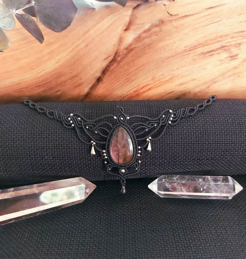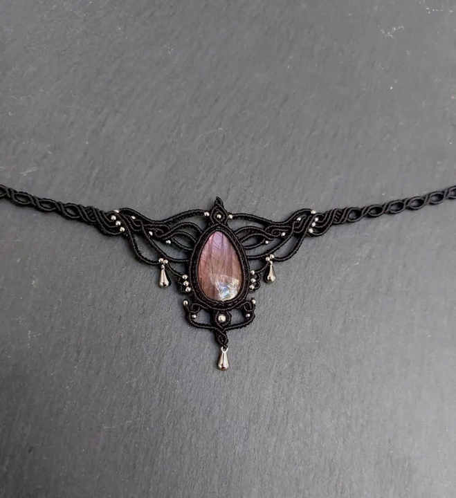 สร้อยคอแฮนด์เมดประดับลาบราโดไรต์แบบมาคราเม่ เชือกสีดำ สไตล์โบโฮ กอธิค รูปทรงลูกบอล ของขวัญเครื่องประดับ