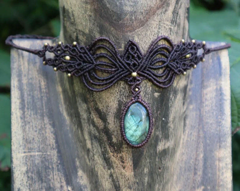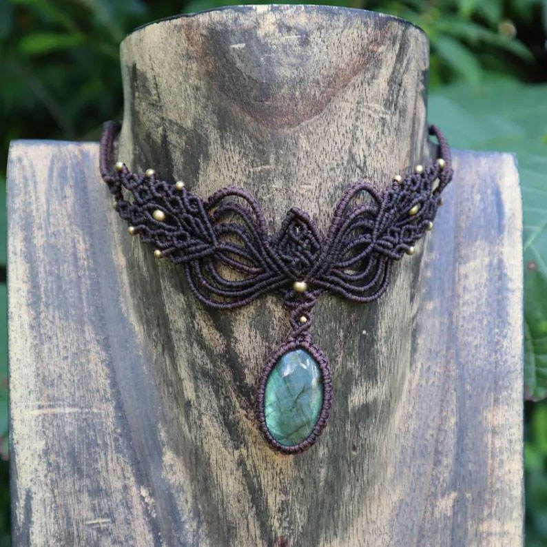 สร้อยคอแฮนด์เมดประดับลาบราดอไรต์แบบมาคราเม่ สไตล์โบโฮ เชือกสีดำ จี้ห้อยประดับพลอยบำบัด ขายส่ง