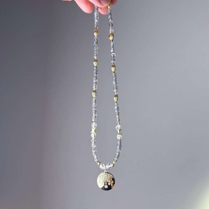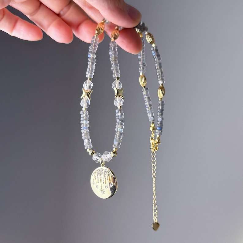 สร้อยคอจี้ฝนดาวตกรูปลาบราดอไรต์และพลอยเทียมเทียมสำหรับผู้หญิงทำด้วยมือ