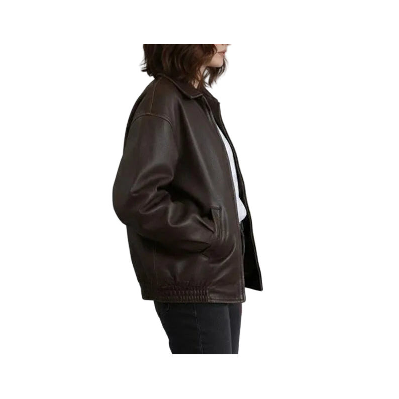 แจ็คเก็ตบอมเบอร์หนังวัวแท้สีน้ำตาลทรงโอเวอร์ไซส์สำหรับผู้หญิง ทำมือ หนังฟูลเกรน กันน้ำ กันลม แห้งเร็ว ความยาวสั้น