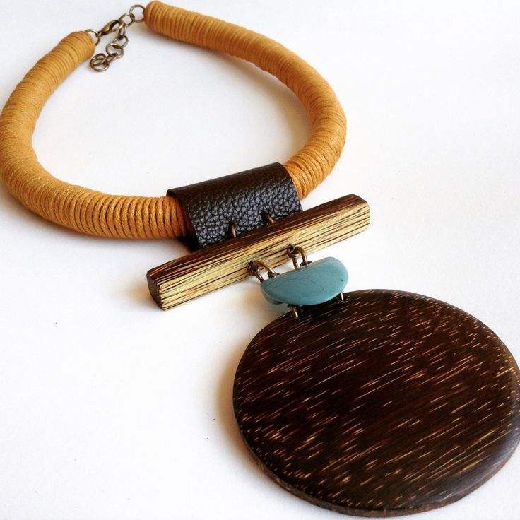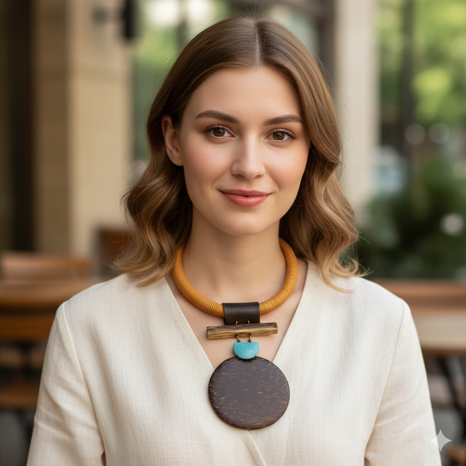 สร้อยคอจี้ไม้แผ่นใหญ่ทำมือ - สไตล์โบฮีเมียน ทำจากไม้ปาล์ม ประดับด้วยหินเทอร์ควอยซ์บนเชือกสีมัสตาร์ด