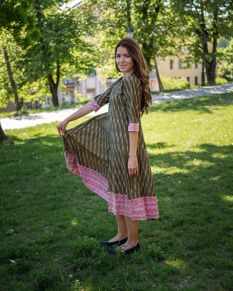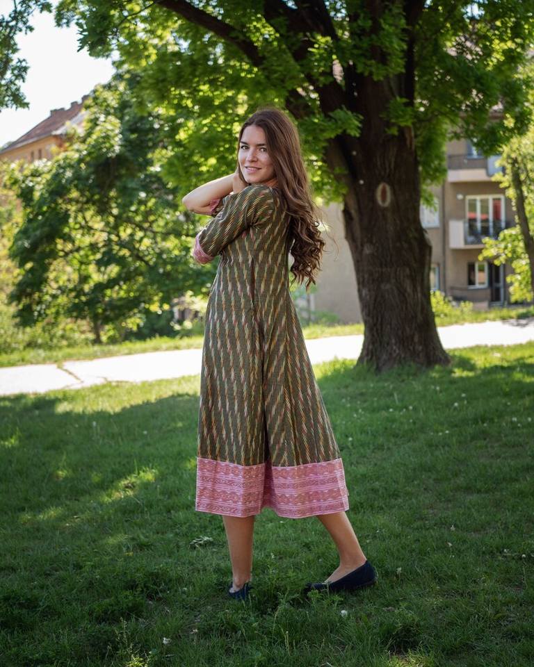 ชุดเดรสลิซ่าทำมือ ความยาวระดับน่อง สไตล์โบฮีเมียน ผ้าฝ้ายอิคัตทอมือ สีเทาอมชมพู ลำลอง ใส่ได้หลายโอกาส แฟชั่นที่เป็นมิตรต่อสังคม