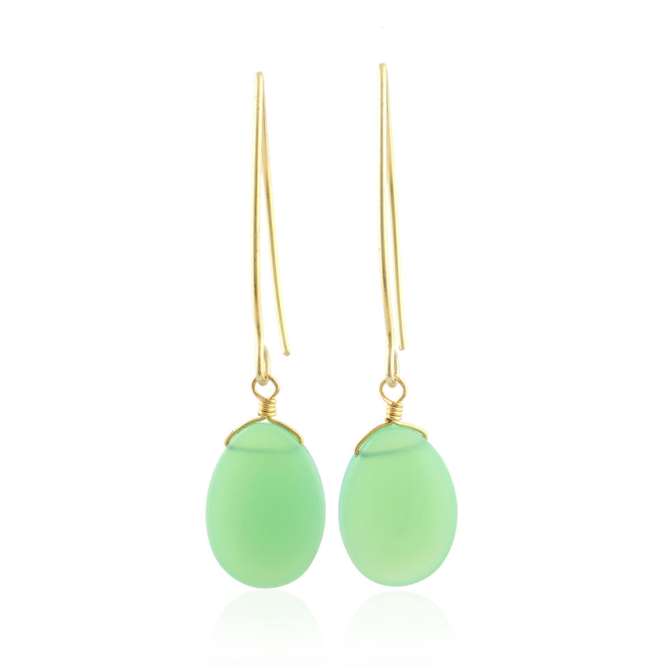 ต่างหูห้อยตะขอยาวทำด้วยมือเครื่องประดับพลอยคาลซิโดนีธรรมชาติประดับด้วยลวดชุบทอง