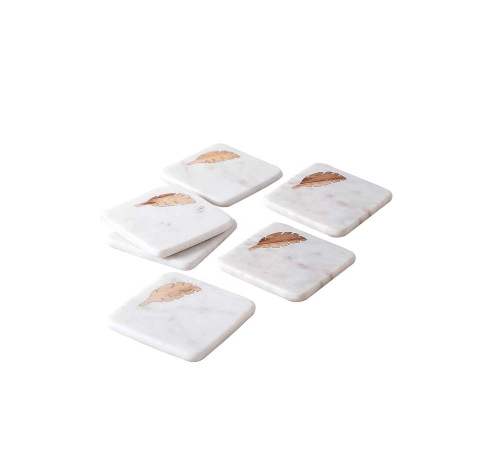 ชุดจานรองแก้วสแตนเลสสตีลทรงสี่เหลี่ยมคลาสสิกสีขาวทองฝังลาย งานแฮนด์เมด MOQ ต่ำ เป็นมิตรกับสิ่งแวดล้อม จำนวน 4 ชิ้น ผู้ผลิต ผู้ค้าส่ง ขายส่งจำนวนมาก