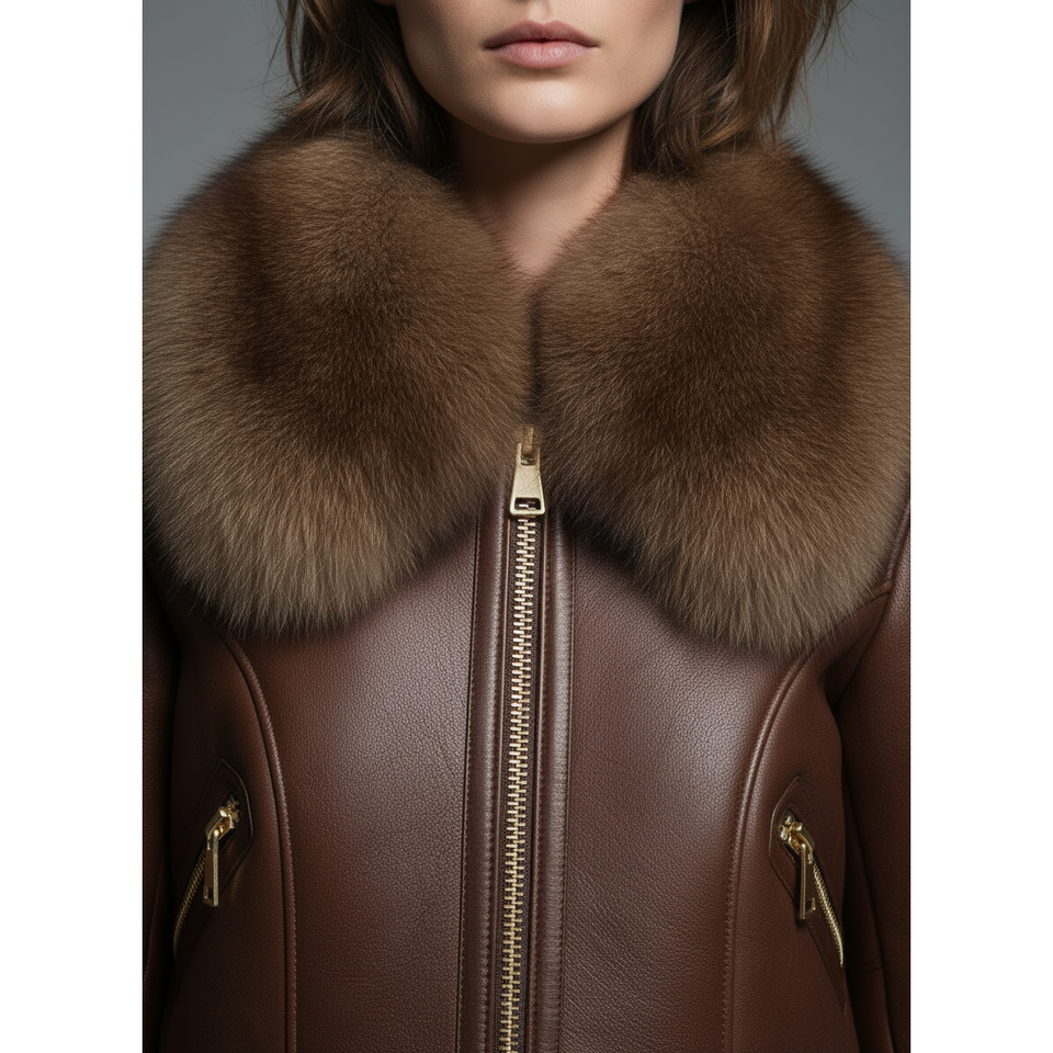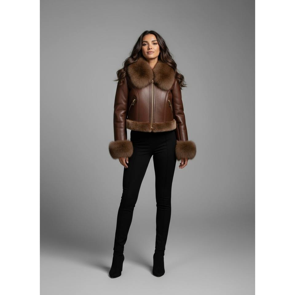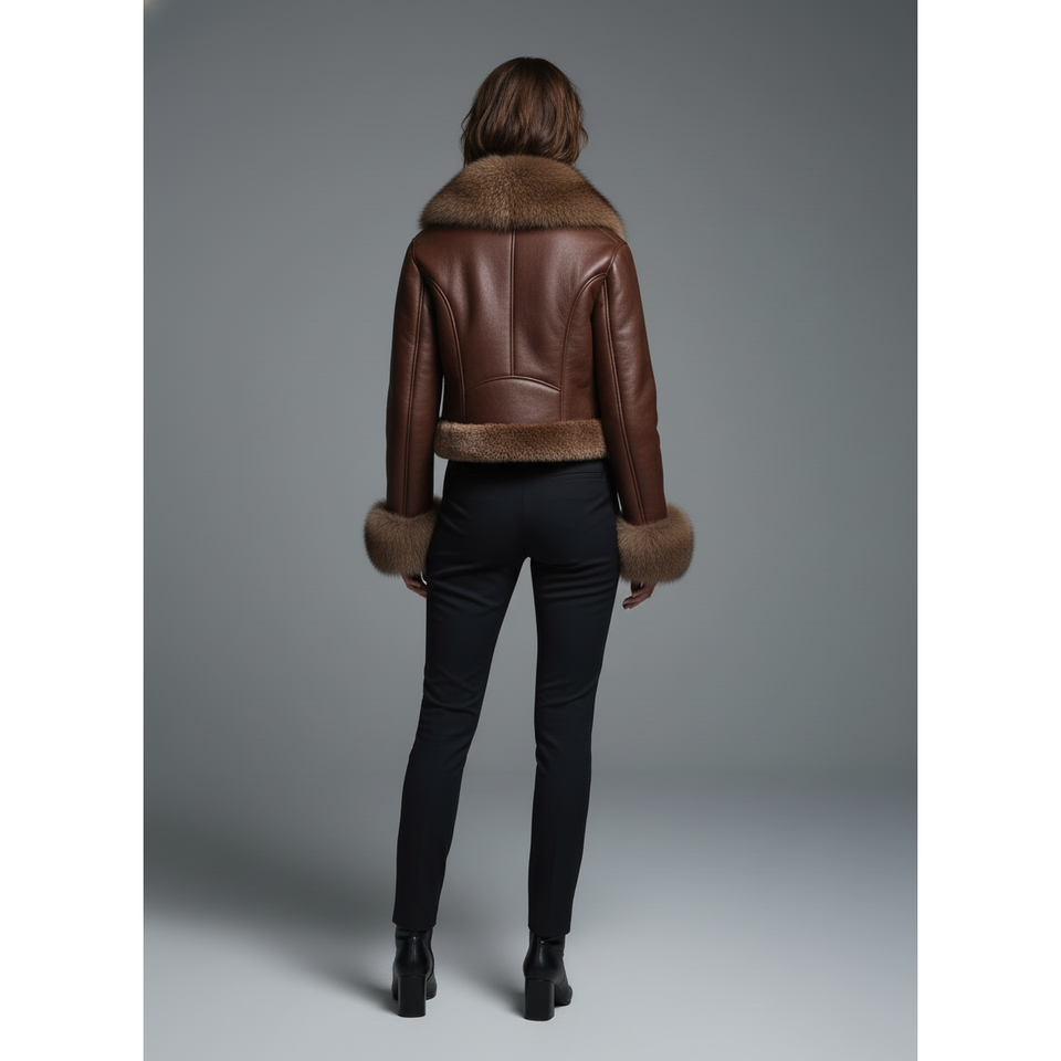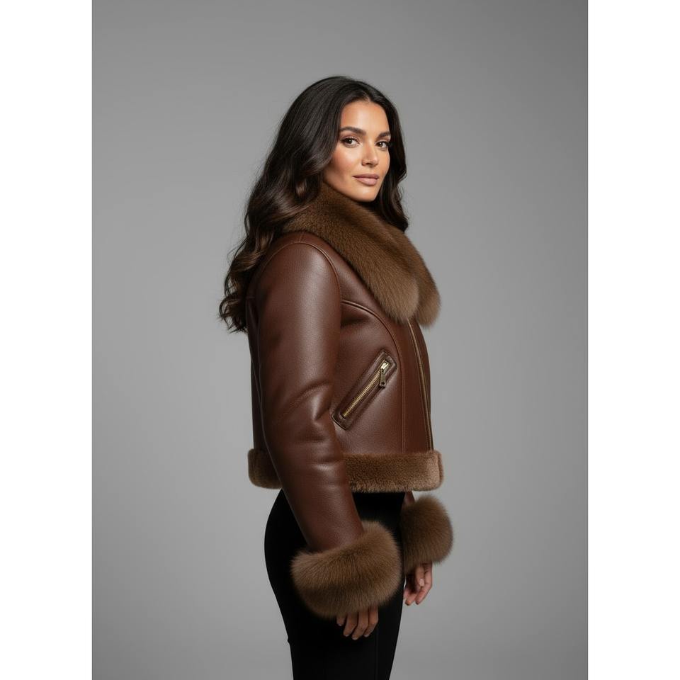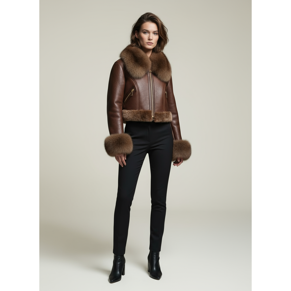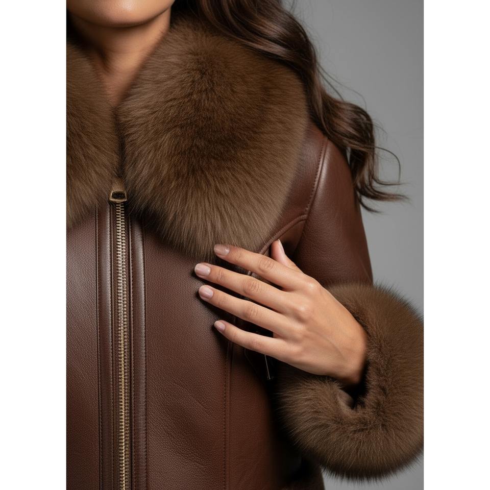 เสื้อแจ็กเก็ตหนังนิ่มสำหรับผู้หญิงหรูหราทำด้วยมือเสื้อโค้ทสั้นมีปกและแขนเสื้อขนสัตว์จริง