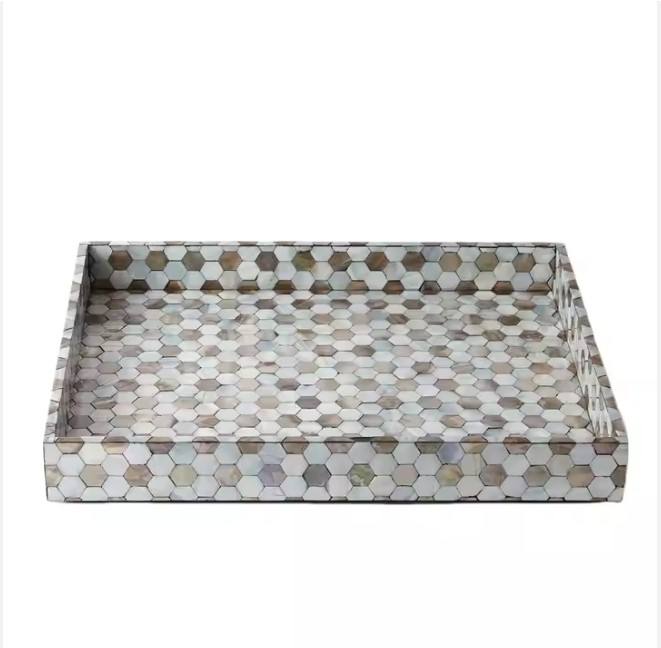 ถาดมุกแฮนด์เมด MDF ถาดสำหรับตกแต่งและเสิร์ฟพร้อมหูจับถาดใส่ดอกไม้สีฟ้าหรูหรา
