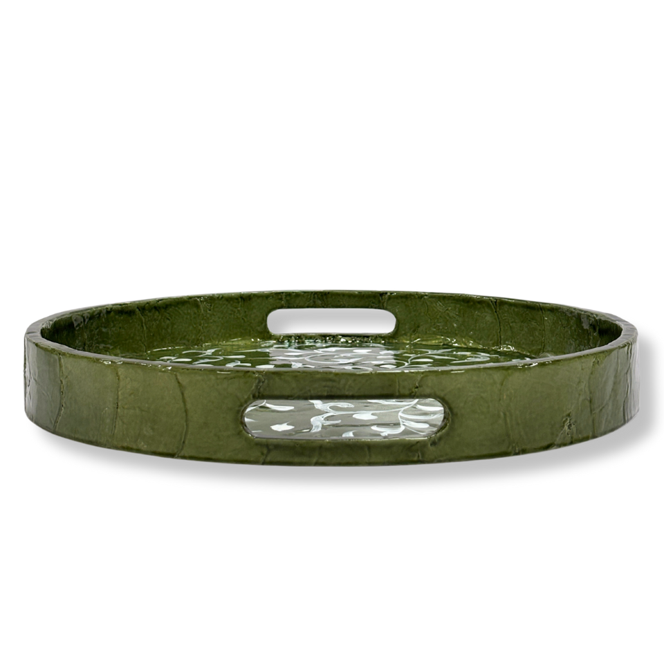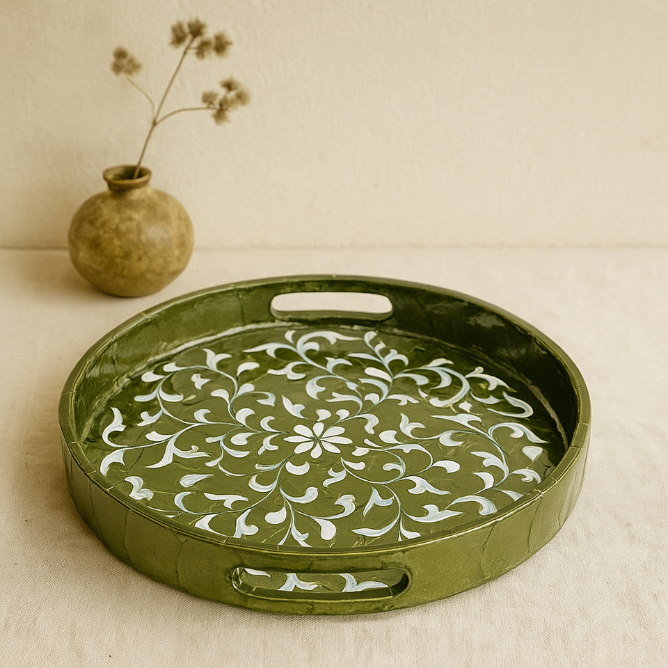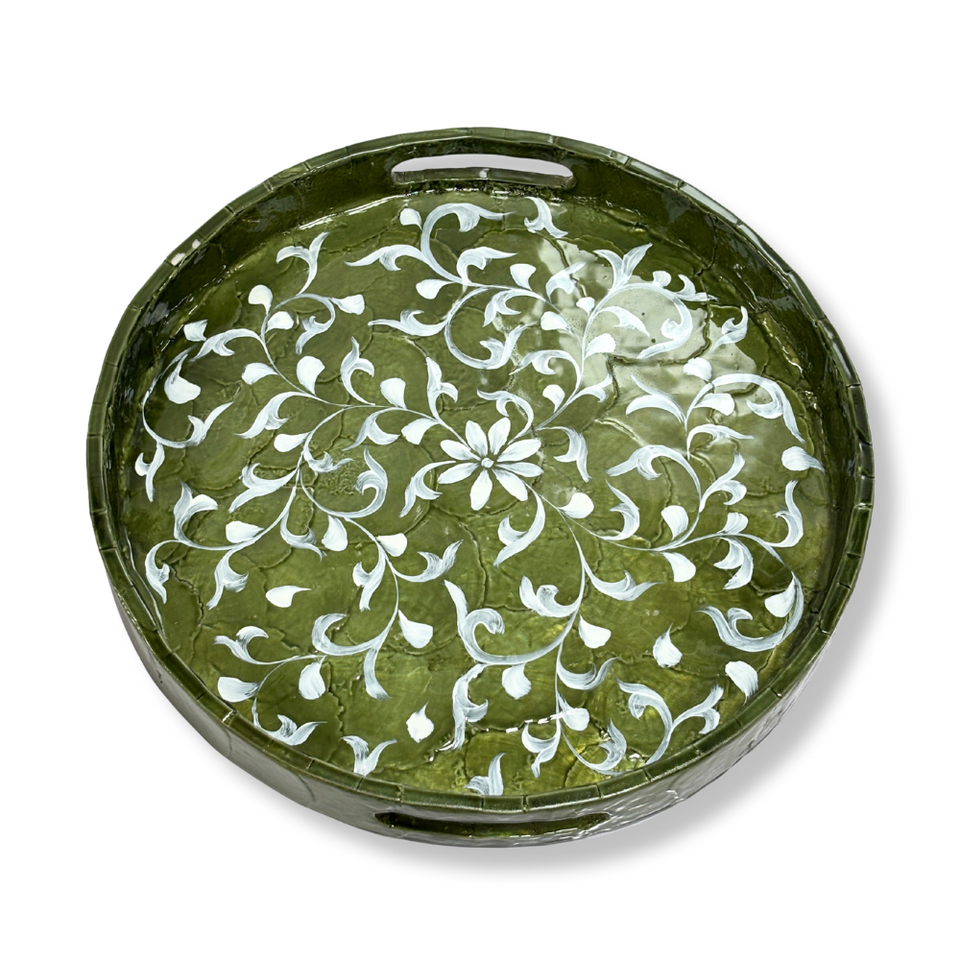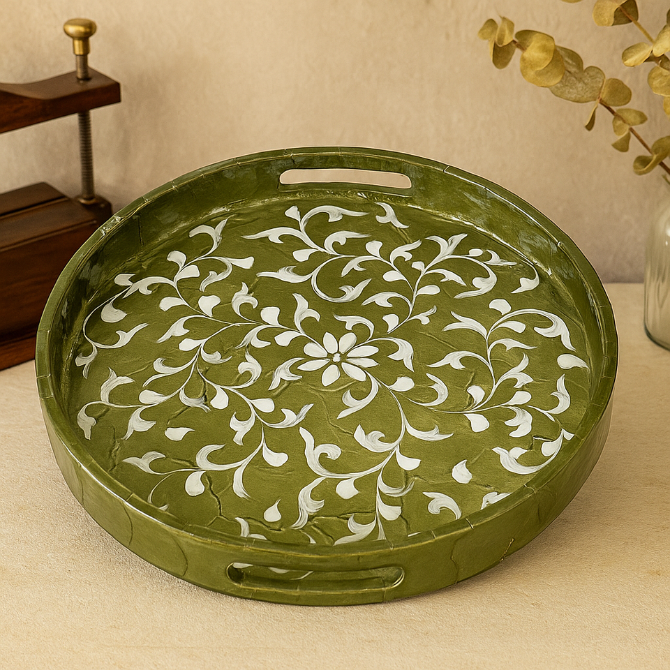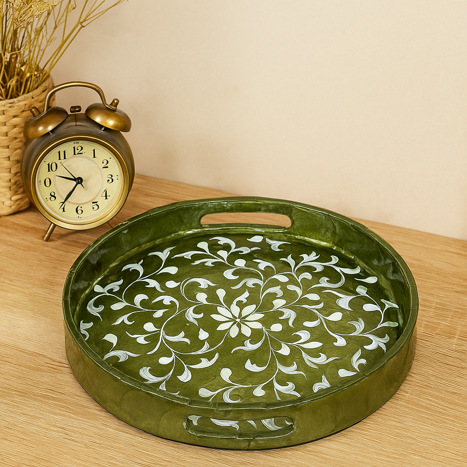 ถาดฝัง capiz ทรงกลม MDF หรูหราถาดใส่ดอกไม้สีเขียวทำด้วยมือถาดเสิร์ฟตกแต่งโต๊ะกาแฟอย่างยั่งยืนของตกแต่งบ้าน