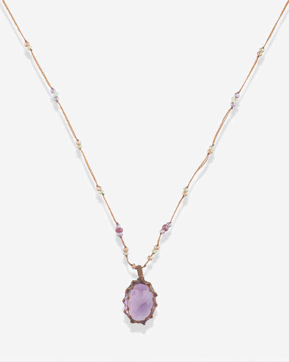 สร้อยคอมาคราเม่ทำมือประดับอเมทิสต์ทรงรีสีม่วง พร้อมจี้หินและเชือกประดับลูกปัดยาว สไตล์โบโฮ เครื่องประดับแฮนด์เมดสำหรับผู้หญิง