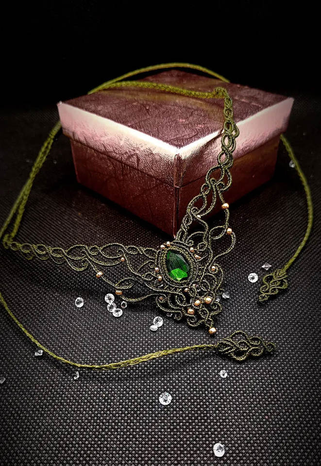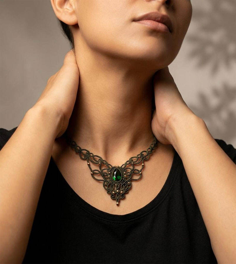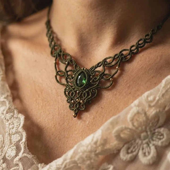 สร้อยคอจี้มรกตทำมือสไตล์มาคราเม่ โบโฮธรรมชาติ ปรับได้ สายสีเขียว เครื่องประดับเพื่อสุขภาพ