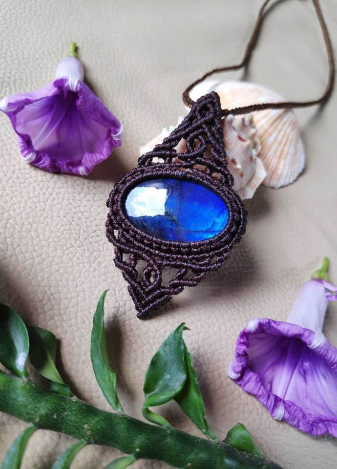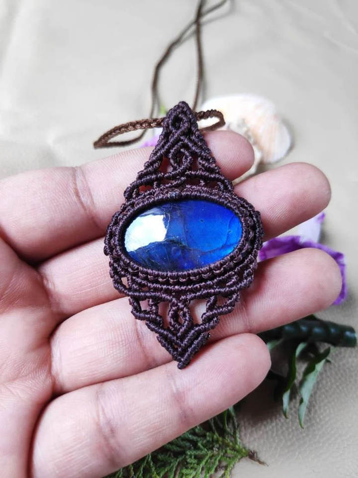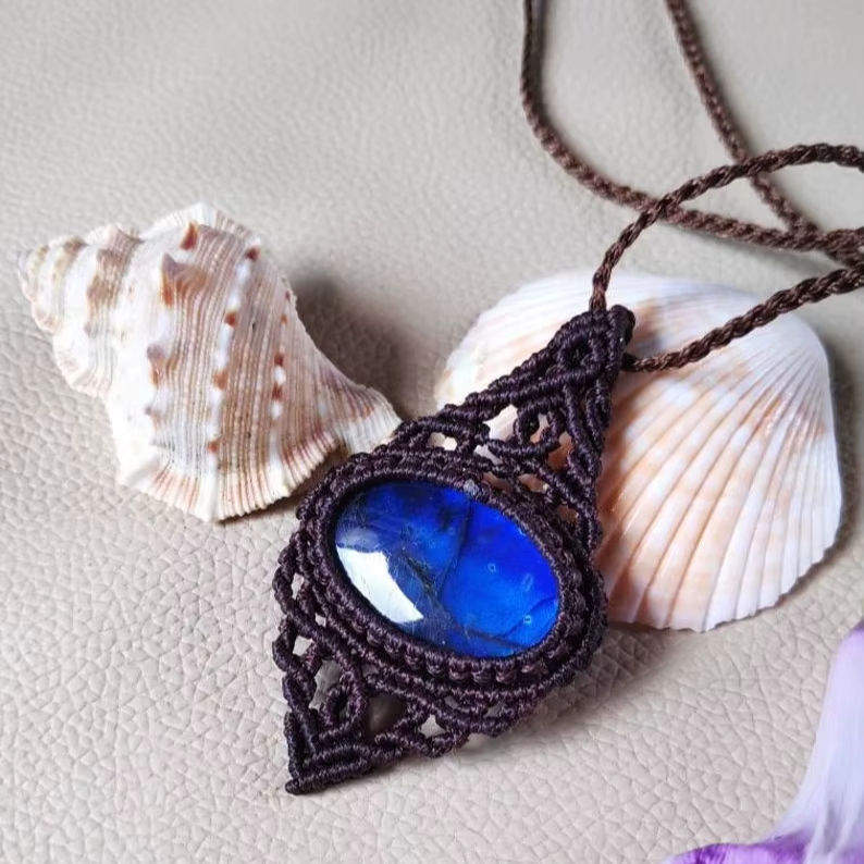 สร้อยคอจี้หินลาบราดอไรต์ทำมือ งานฝีมือประณีต พร้อมสายปรับได้ สไตล์โบโฮ ประดับด้วยพลอยสีฟ้าธรรมชาติ
