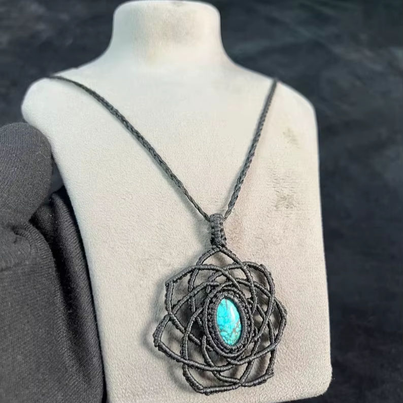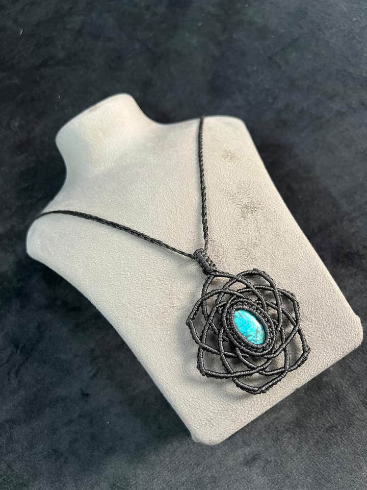 สร้อยคอจี้หินเทอร์ควอยซ์ทำมือสไตล์มาคราเม่ โบโฮธรรมชาติ ปรับได้ สายสีดำ เครื่องประดับบำบัด