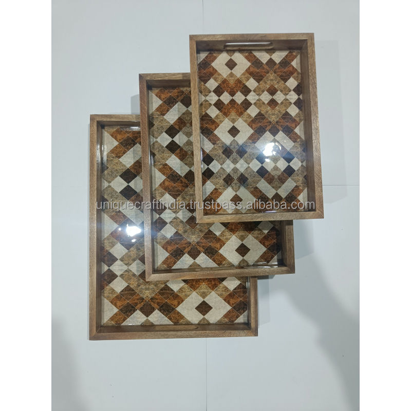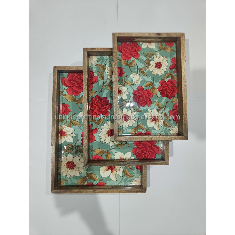 ชุดถาดเสิร์ฟไม้มะม่วงทำมือ ลายดอกกุหลาบแดงเคลือบเงา งานศิลปะตกแต่ง ถาดไม้เสิร์ฟ | ของตกแต่งบ้านสไตล์คลาสสิก
