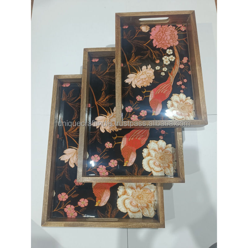 ชุดถาดเสิร์ฟไม้มะม่วงทำมือ | ถาดอาหารเช้าไม้เคลือบลายดอกไม้เขตร้อนสีเขียวอมฟ้าพร้อมหูจับ