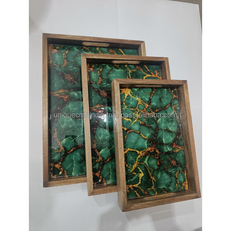 ชุดถาดเสิร์ฟไม้มะม่วงทำมือ ลายพัดทองอาร์ตเดโคเคลือบเงา ถาดไม้ตกแต่งสำหรับอาหารเช้า ของตกแต่งบ้านสุดหรู
