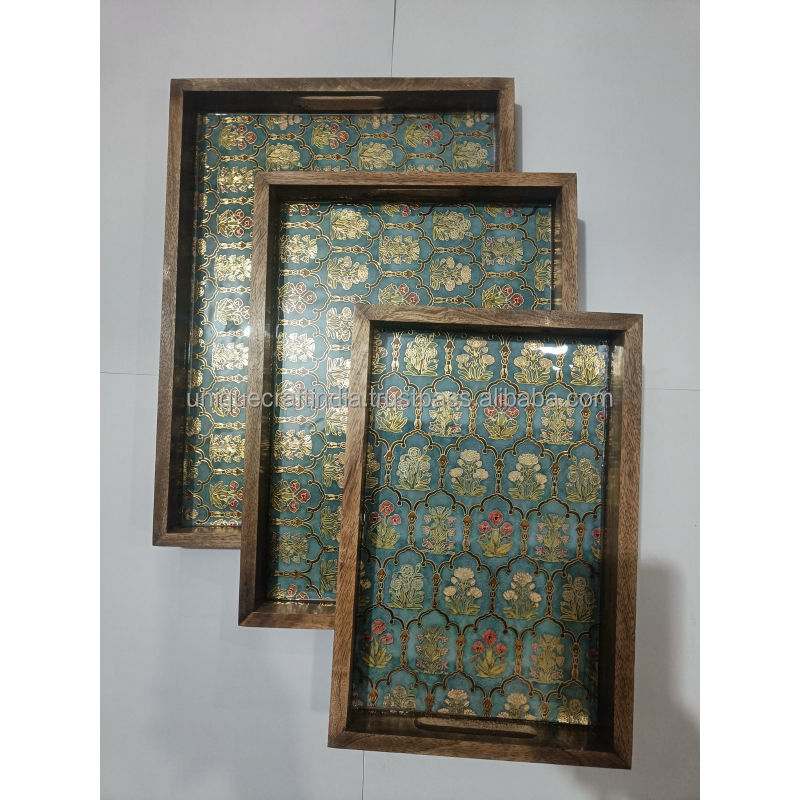 ชุดถาดเสิร์ฟไม้มะม่วงทำมือ สีเขียวอมฟ้าทอง ลายโมกุฎจัลลีเคลือบเงา ถาดเสิร์ฟตกแต่งพร้อมหูจับ ของตกแต่งบ้านสุดหรู