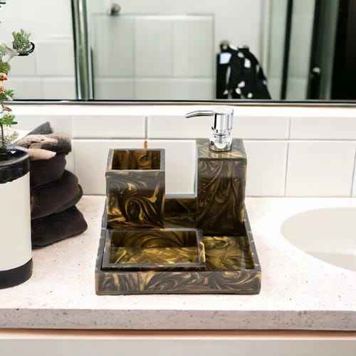 ชุดอุปกรณ์ห้องน้ำเรซินป้องกันสนิม4ชิ้นอุปกรณ์เสริมรูปทรงหินอ่อนที่จ่ายสบู่ที่วางแปรงผ้าเช็ดตัวถาดใส่สบู่จานสบู่ใช้ในบ้าน
