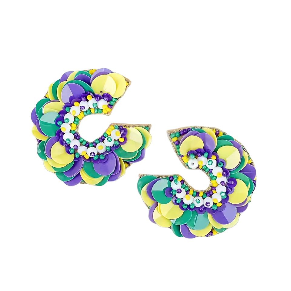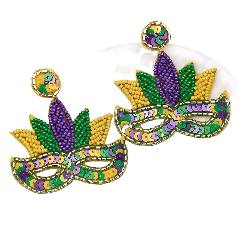 ต่างหูลูกปัดทำด้วยมือมาร์ดิกราส์ประดับด้วยลูกปัดสีม่วงสีเขียวทองเครื่องประดับแฟชั่นสำหรับงานเฉลิมฉลองเทศกาล