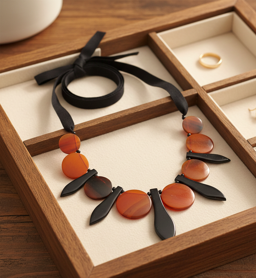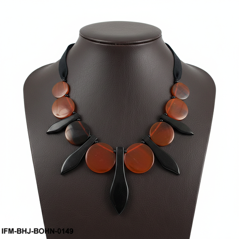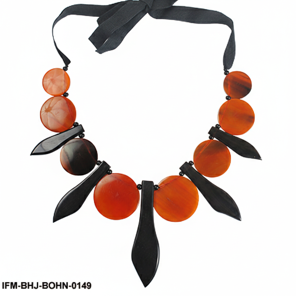 สร้อยคอทำมือจากเขาควาย ประดับด้วยก้านดอกสีดำขัดเงาและแผ่นสีส้มจาฟฟ่าบนริบบิ้นโกรเกรนผูกปม