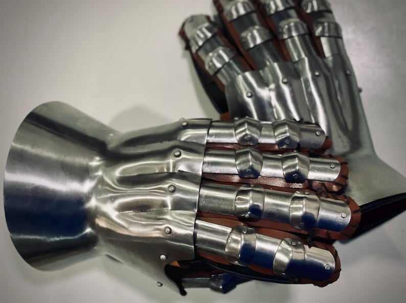 ถุงมืออัศวินยุคกลางทำด้วยมือถุงมือเกราะเหล็กและหนังแบบกอธิคสำหรับคอสเพลย์และรีแนคท์สำหรับตกแต่งบ้าน