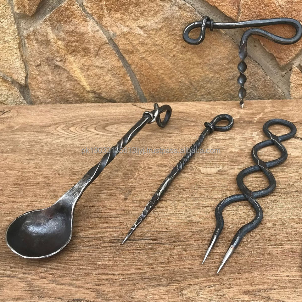 ชุดช้อนส้อมมีดไวกิ้งสำหรับกลางแจ้งยุคกลางงานแฮนด์เมดชุดช้อนส้อมทรงแบนพร้อมกระเป๋าหนัง
