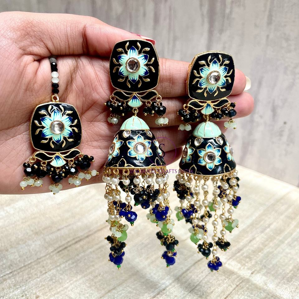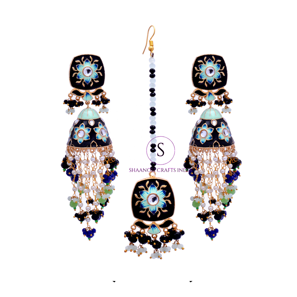 ต่างหูทำมือ meenakari jhumka แบบดั้งเดิมเครื่องประดับงานแต่งงานสไตล์ jhumka เคลือบ Maang Tika