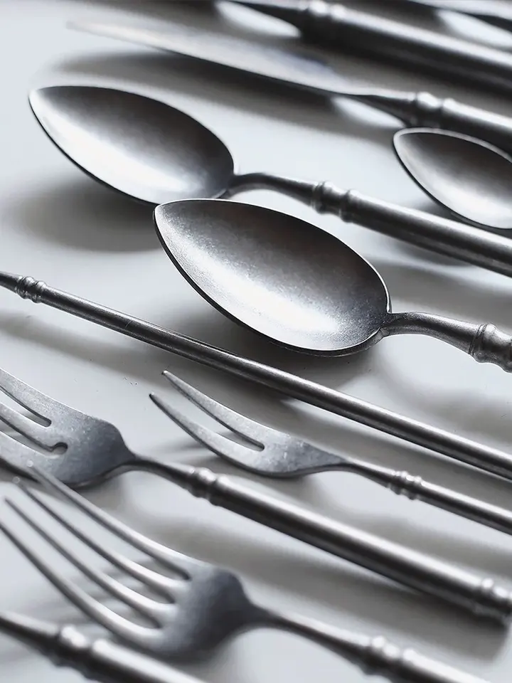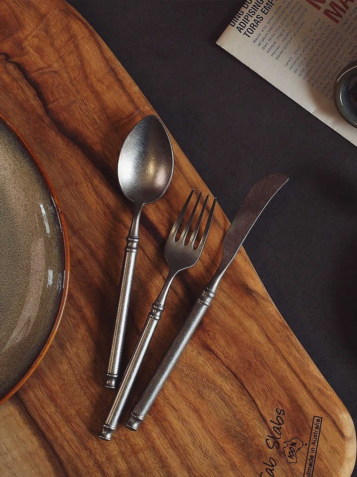 ชุดมีดสแตนเลสสำหรับงานเลี้ยงดีไซน์วินเทจสีเงินทำด้วยมือประกอบด้วยช้อนขนมส้อมมีด