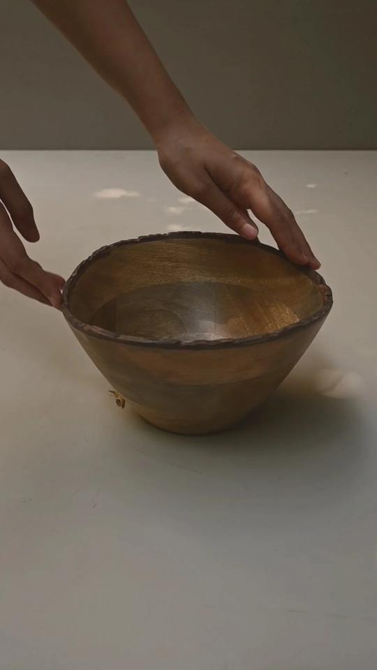 ชามเสิร์ฟสไตล์บ้านไร่ทำมือจากโลหะ พร้อมขอบเปลือกไม้ธรรมชาติ สำหรับใส่ผลไม้และสลัด