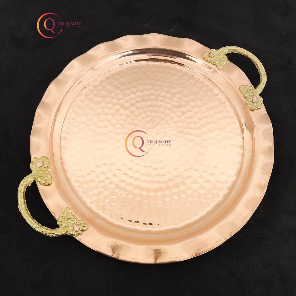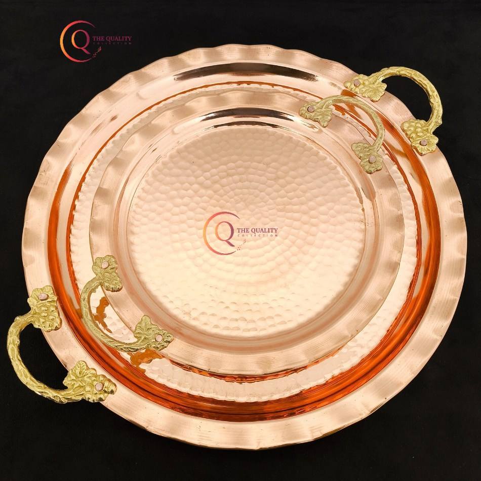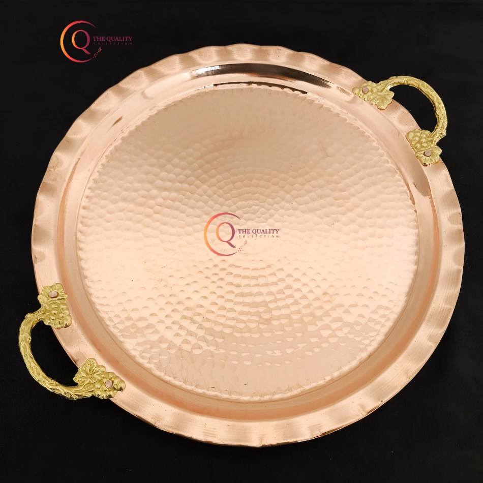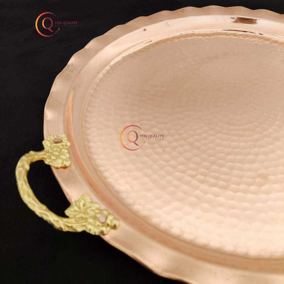 ถาดเสิร์ฟทองแดงทรงกลมทำด้วยมือพร้อมด้ามจับชุบทองอุปกรณ์สำหรับงานเลี้ยงงานแต่งงาน
