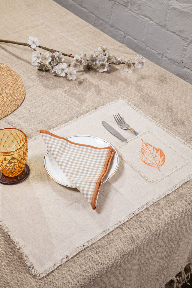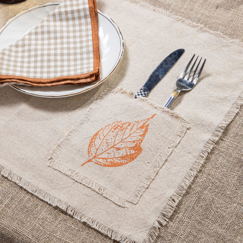 ชุดแผ่นรองจานแบบพกพาทำมือ ทันสมัย เป็นมิตรกับสิ่งแวดล้อม ทำจากผ้าฝ้ายและผ้าลินิน พิมพ์ลาย พร้อมผ้าเช็ดปากแบบซักได้ ขอบตกแต่งด้วยพู่ 2 ชิ้น แบบสั่งทำพิเศษ