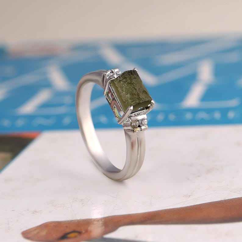 ทำด้วยมือ moldavite แหวนเงินสเตอร์ลิงดิบแหวนคริสตัลอุกกาบาตเครื่องประดับ Boho ของขวัญที่ไม่ซ้ำกันสำหรับเธอ