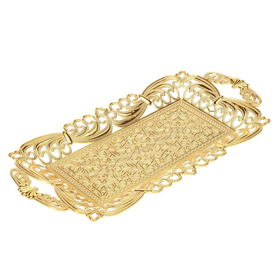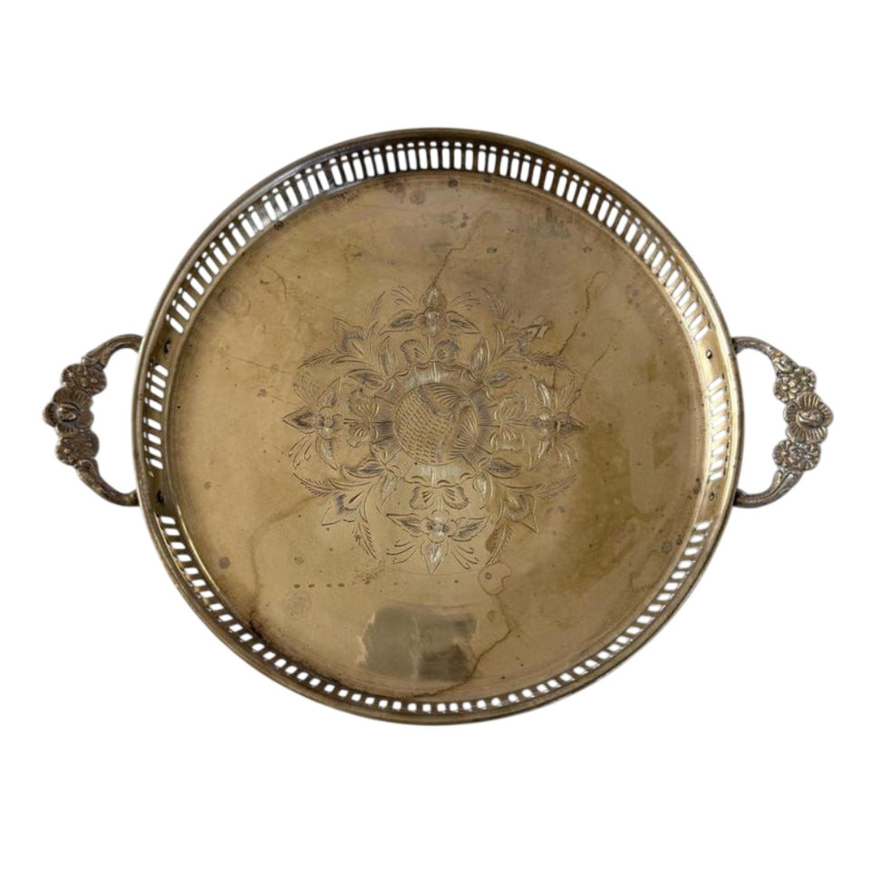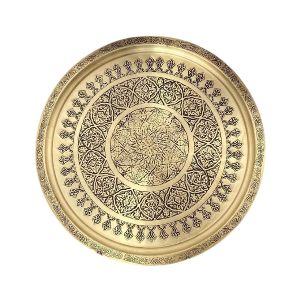 ถาดเสิร์ฟทองเหลืองโมร็อกโกทำมือ ทรงกลม แกะสลักลายโลหะ จานตกแต่งสไตล์วินเทจ ถาดชาแบบตะวันออก ของตกแต่งบ้านสไตล์อิสลาม
