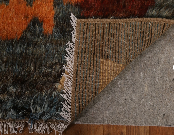 พรมปูพื้นขนสัตว์โมร็อกโกทำด้วยมือลวดลายพรมชนเผ่าหลากสีโทนสีน้ำตาลส้มสีเบจสนิมและสีเทาสำหรับบ้าน