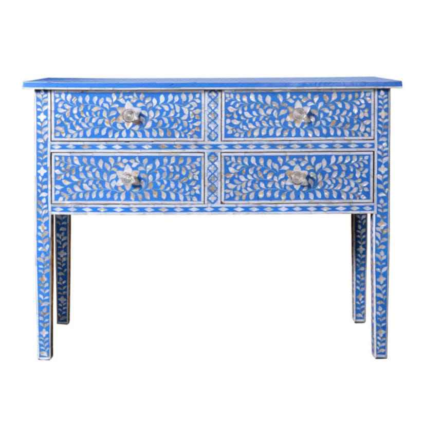 โต๊ะคอนโซลฝังกระดูกสไตล์ร่วมสมัยเฟอร์นิเจอร์อินเดียทำมือแบบ100% สีน้ำเงินและสีขาวสำหรับตกแต่งบ้านที่หรูหรา
