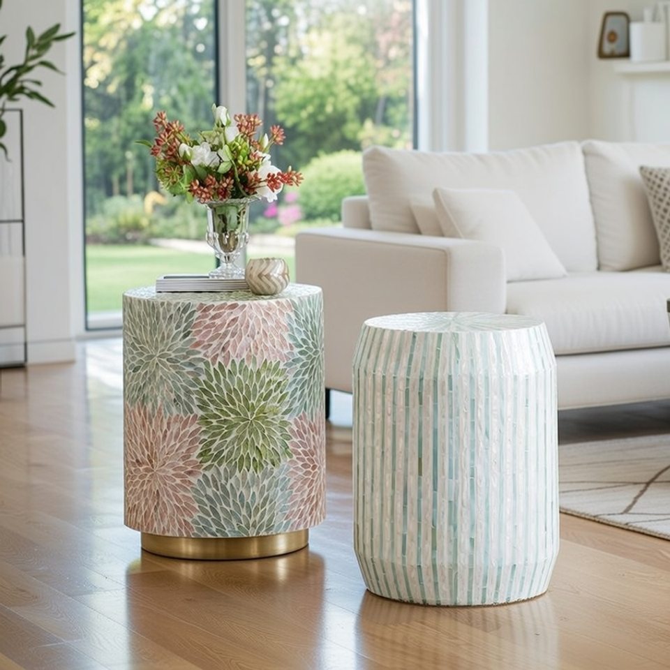 โต๊ะกาแฟฝังมุกทำมือ ลายดอกไม้ ทรงกลม เฟอร์นิเจอร์ฝังกระดูกงู โต๊ะกลางตกแต่งหรูหรา