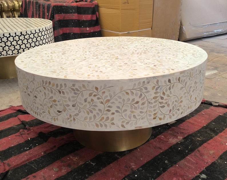 Handmade Mother of Pearl Inlay Coffee Table Floral Centerpiece Coffee Table with MOP Inlay Decorative Mother of Pearl