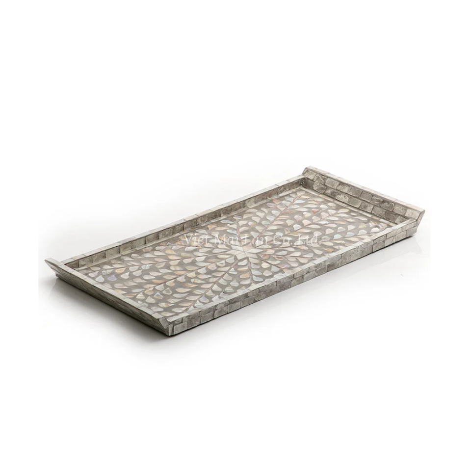 ถาดเสิร์ฟมุกทำมือจากเวียดนาม ขายส่งจำนวนมาก ฝังเปลือกหอยธรรมชาติ เป็นมิตรกับสิ่งแวดล้อม ถาดตกแต่ง