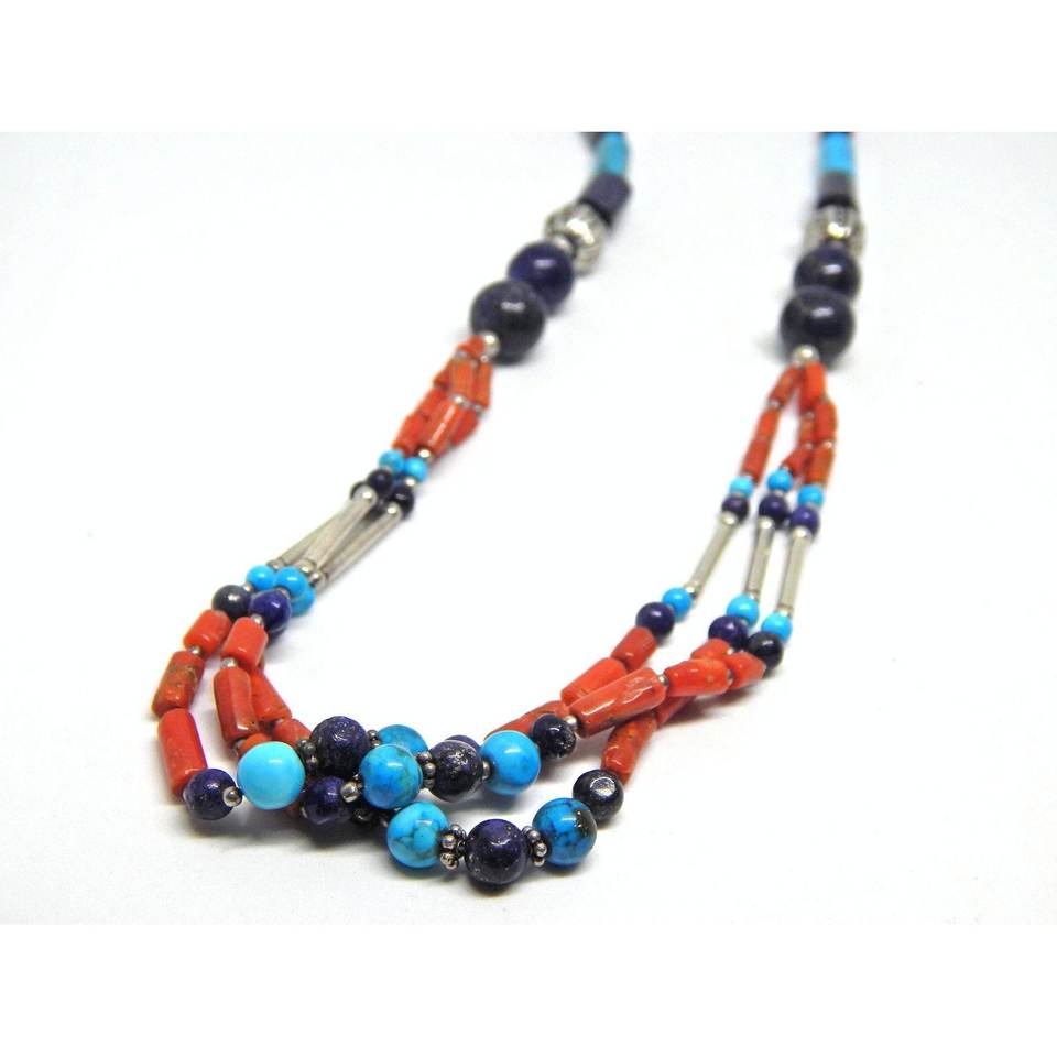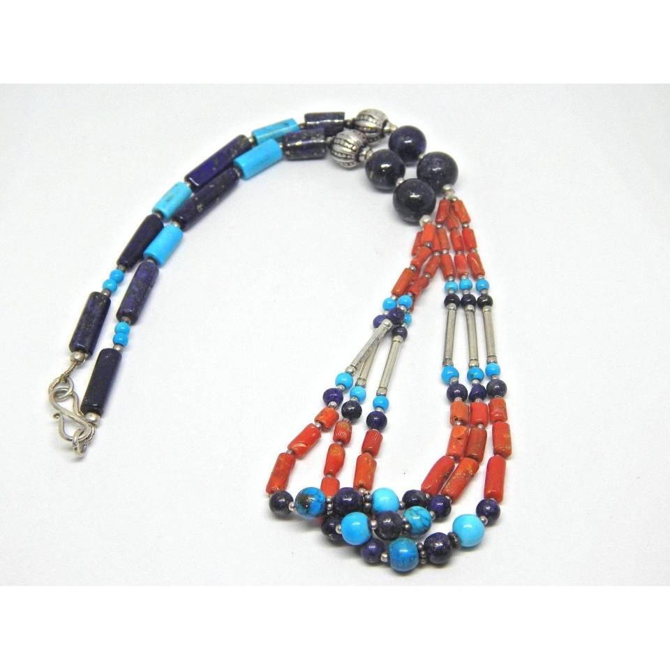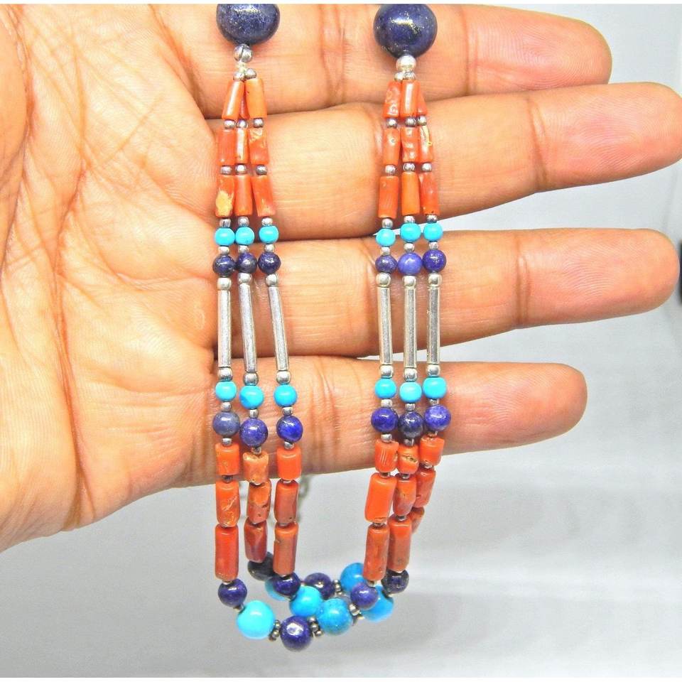 ทำด้วยมือหลายลูกปัดสร้อยคอแท้ Lapis Lazuli ปะการังเทอร์ควอยส์พลอยธรรมชาติเครื่องประดับเงินสเตอร์ลิงพร้อมไข่มุก