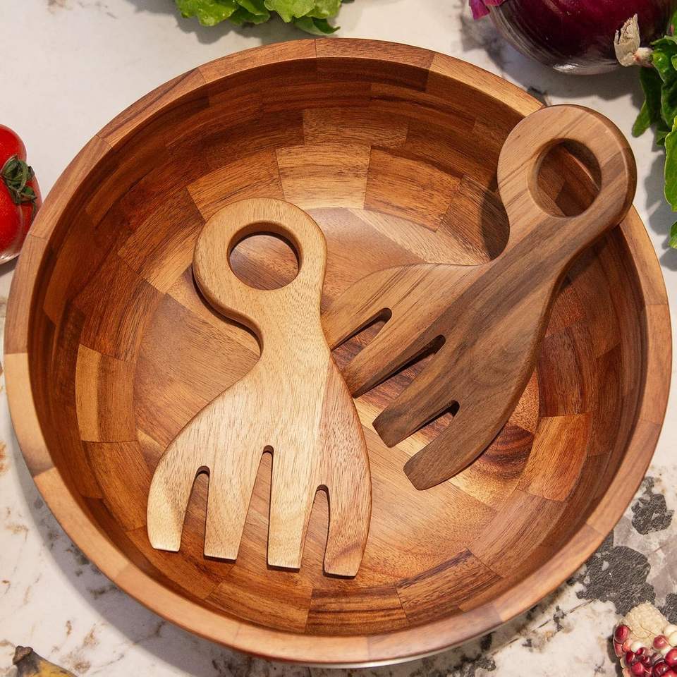 ชามไม้อะคาเซียทำด้วยมือพร้อมสลัดเซิร์ฟเวอร์สำหรับบนโต๊ะอาหารและเครื่องครัวจากเวียดนาม