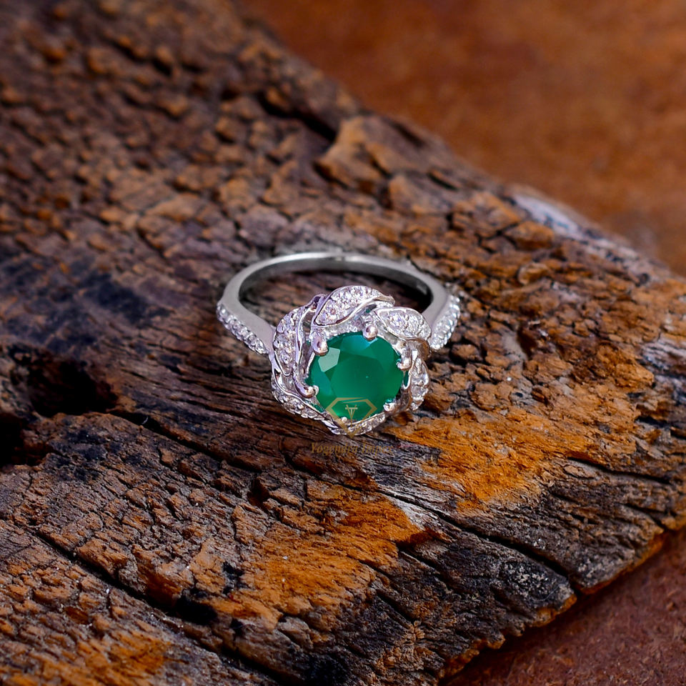 แหวนแต่งงานเงินแท้925ทำด้วยมือแหวนแฟชั่นชุบโรเดียมพลอยโอนิกซ์สีเขียวธรรมชาติ