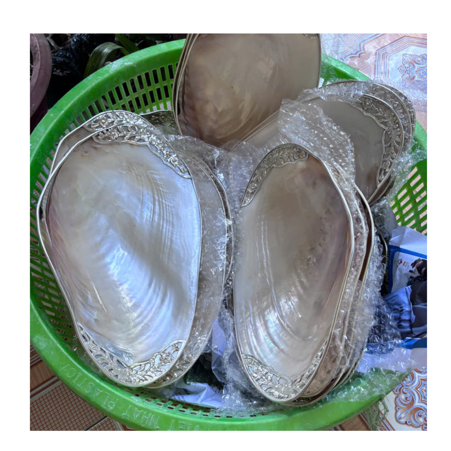 จานเปลือกหอยมุกธรรมชาติทำด้วยมือจานเปลือกหอยหอยนางรมสีเหลืองหรูหราสำหรับโรงแรมร้านอาหารขนมหวาน