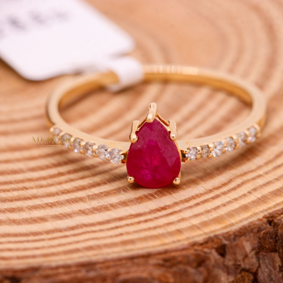 แหวนเพชรอัญมณีทับทิมรูปลูกแพร์ธรรมชาติทำด้วยมือแหวนทองคำ14K สีเหลืองสำหรับผู้หญิงขายส่ง