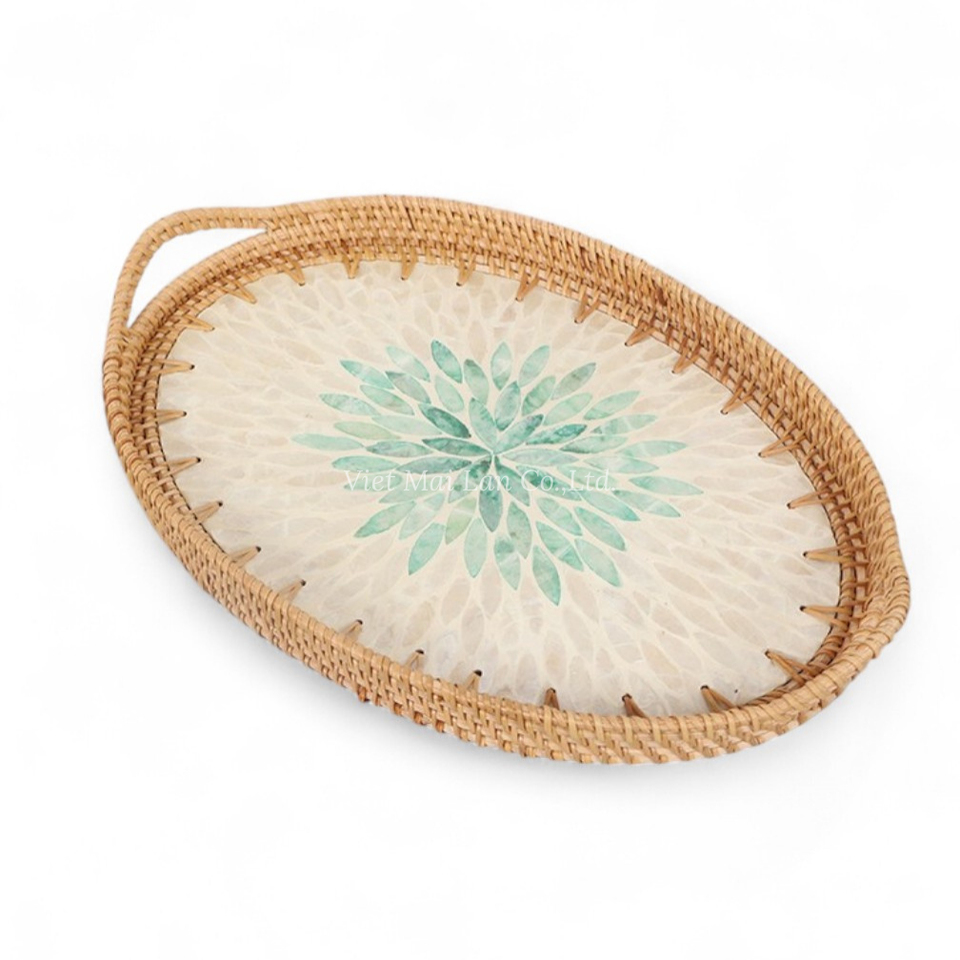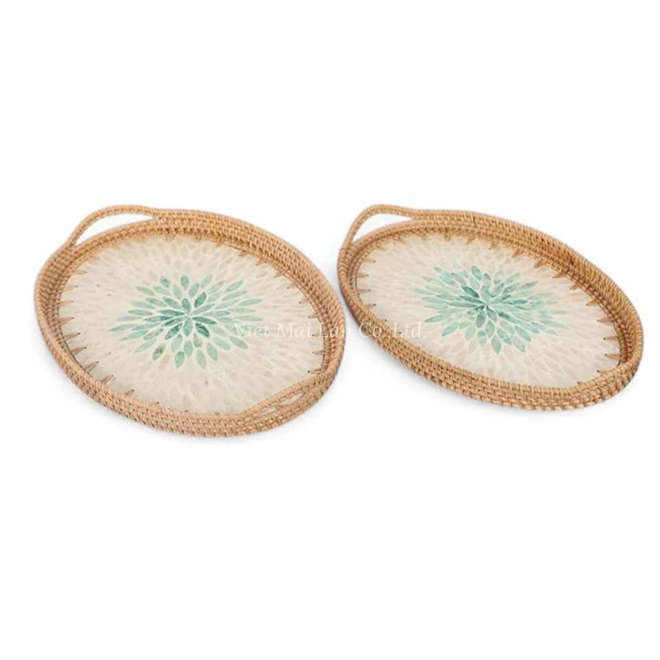 ถาดเสิร์ฟทำมือจากหวายธรรมชาติประดับมุก สำหรับใช้ในครัว รับประทานอาหาร จัดเสิร์ฟอาหาร และตกแต่งโต๊ะ