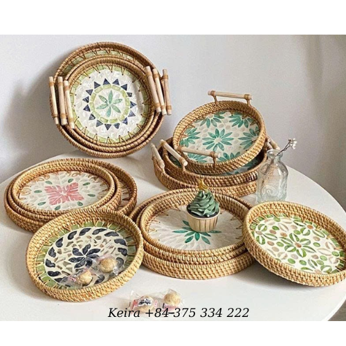ถาดเสิร์ฟทำมือจากหวายธรรมชาติและเปลือกหอยมุก สำหรับตกแต่งบ้านและจัดวางบนโต๊ะงานเลี้ยง จากเวียดนาม