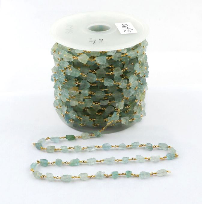 ห่วงโซ่พลอยสีฟ้าดิบธรรมชาติทำด้วยมือขนาด8-10มม. หินวันเกิดประดับลูกปัดโรสเทอรี่พร้อมลวดชุบทองทำจากทองเหลือง